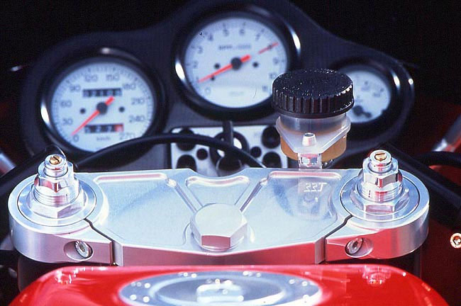 Roland Däs hat seine Erfahrungen aus seiner aktiven Zeit in der BOT-Rennklasse hier konsequent umgesetzt. Mittels 17 Zoll PVM-Felgen, breiterer Schwinge mit längeren Federbeinen, sowie der Verwendung einer USD-Gabel in Verbindung mit speziell entwickelten Exzenterlagerbuchsen und entsprechenden CNC-gefrästen Gabelbrücken wird die Fahrwerksgeometrie auf mehr Handlichkeit getrimmt.