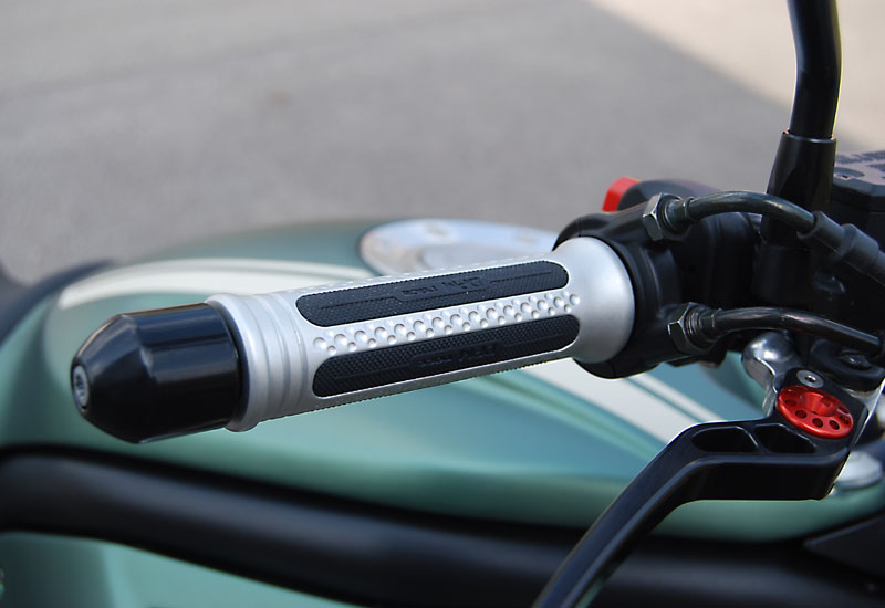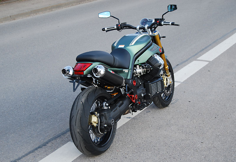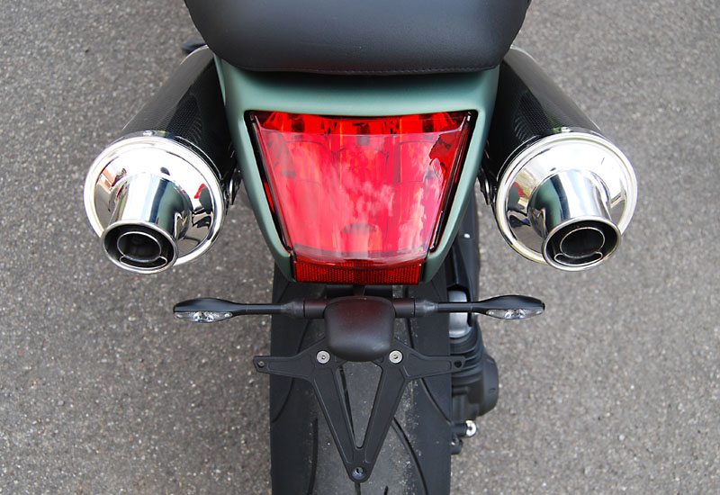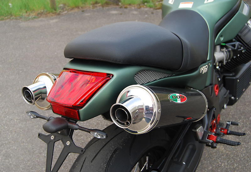 Allein das kürzere, schmale Heck in Verbindung mit der hochgelegten 2-2 Auspuffanlage und den kleineren, schmalen Seitenverkleidungen am Tank machen die GRISO ungemein kompakt und verhelfen ihr zu einer sportlich knackigen Optik. Viele weitere Details wie z.B. die gefrästen Brems-/Kupplungshebel oder die CNC-gefrästen Rahmenabdeckungen und Fersenschützer runden den gelungenen Umbau ab.